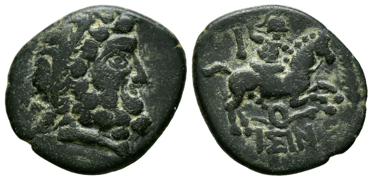PISIDIA, Isinda. Ae20. (Ae. 3,69g/20mm). (SNG France 1570-87). Anv: Cabeza laureada de Zeus a derecha. Rev: Guerrero cabalganso a derecha con lanza, debajo serpiente y leyenda griega. MBC-.