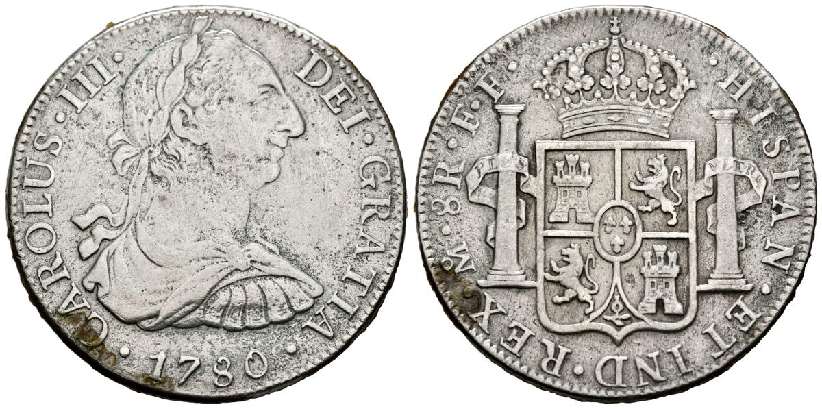 CARLOS III (1759-1788). 8 Reales. (Ar. 26,00g/39mm). 1780. México FF. (Cal-2019-1120). MBC-. Oxidaciones limpiadas