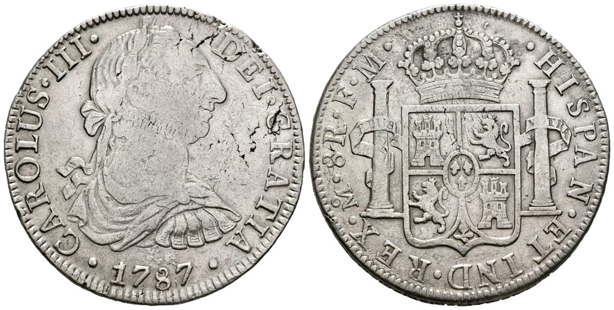 CARLOS III (1759-1788). 8 Reales. (Ar. 26,79g/38mm). 1787. México FM. (Cal-2019-1131). MBC-/MBC. Plata agria.