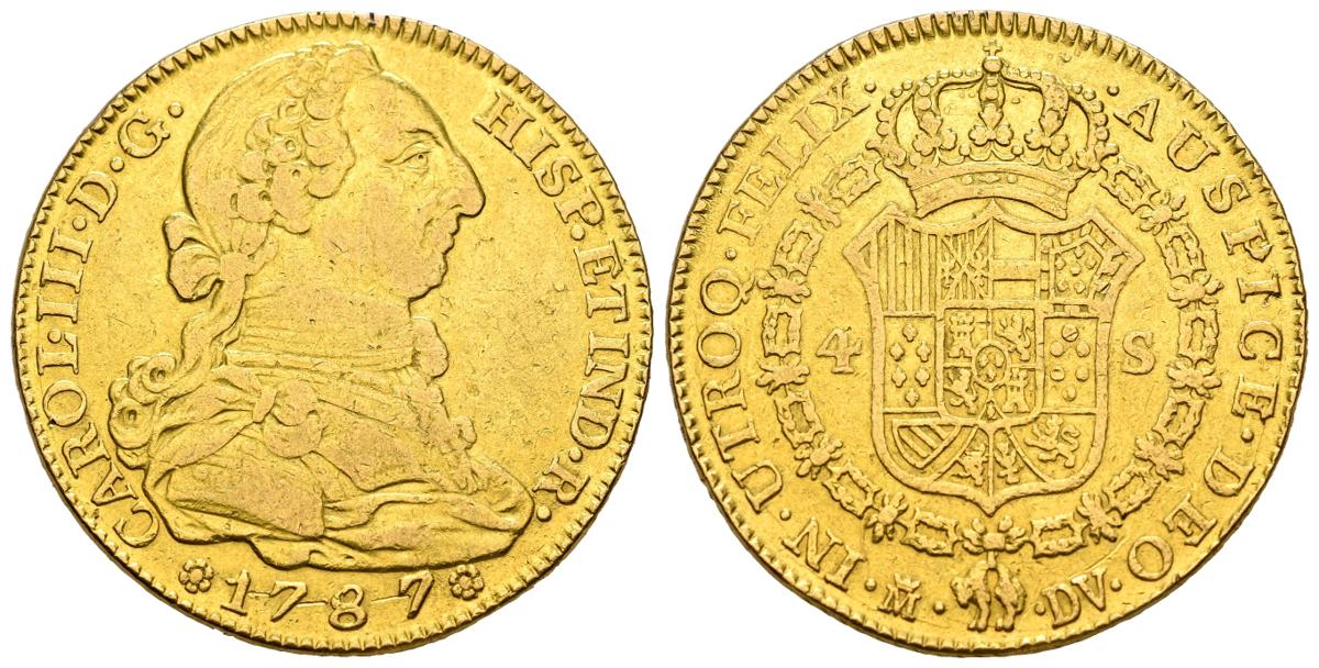 CARLOS III (1759-1788). 4 Escudos. (Au. 13,36g/29mm). 1787. Madrid DV. (Cal-2019-1828). MBC. Sirvió como joya.