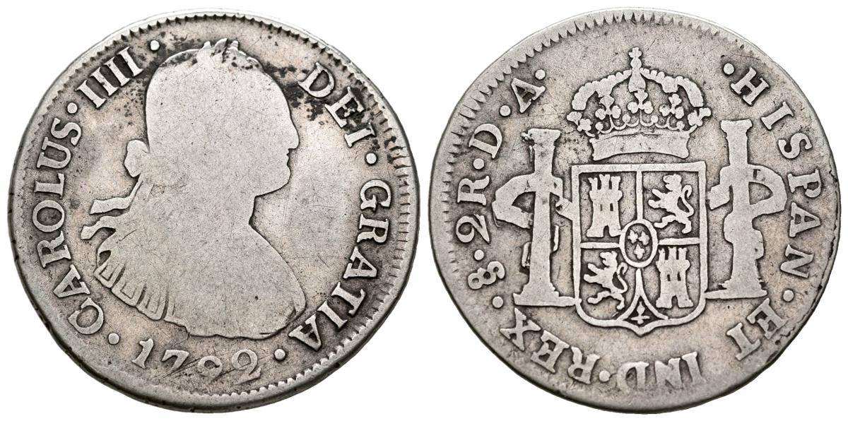 CARLOS IV (1788-1808). 2 Reales. (Ar. 6,29g/28mm). 1792. Santiago DA. Primer año de busto propio. (Cal-2019-689). BC-/BC. Escasa.