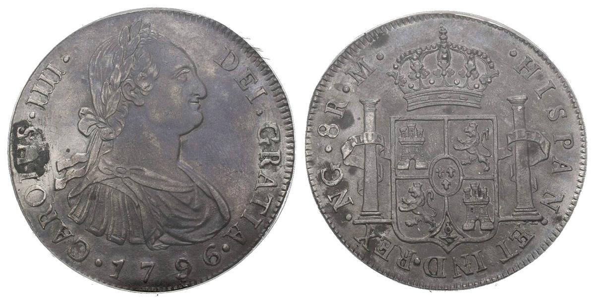 CARLOS IV (1788-1808). 8 Reales (Ar. 27,00g/38mm)*. 1796. Nueva Guatemala M. (Cal-2019-888). AU 53 Details. Engarce retirado. Preciosa pátina. Encapsulada por ANACS.