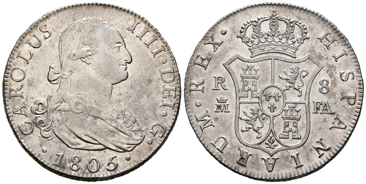 CARLOS IV (1788-1808). 8 Reales. (Ar. 26,93g/39mm). 1805. Madrid FA. (Cal-2019-943). EBC. Ligeramente limpiada. Precioso ejemplar.