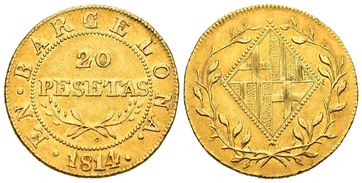 CATALUÑA NAPOLEONICA (1808-1814). 20 Pesetas. (Au. 6,78g/22mm). 1814. Barcelona. (Cal-2019-56). EBC-. Marquitas. Ligerísima rozadura en anverso. Restos de brillo original. Rarísimo ejemplar, y más en esta preciosa calidad.El 26 de enero de 1812 Cataluña es anexionada al Imperio Francés. Se organiza administrativamente en cuatro departamentos: el del Ter (con capital en Girona), el del Segre (con capital en Puigcerdà), el de Montserrat (con capital en Barcelona) y el de las Boques de l’Ebre (con capital en Lleida). Sin embargo, sólo un año después y tras la firma del Tratado Valençay, Francia reconoce a Fernando VII como rey de España y se iniciaba la retirada de las tropas, pero no de Cataluña ya que era territorio francés. Hubo que esperar hasta abril de 1814, tras la abdicación de Napoleón y la vuelta al trono de Luis XVIII, para que Cataluña quedase liberada. Es por este motivo por lo que las acuñaciones de 1814 son tan escasas y tan demandas por los coleccionistas.