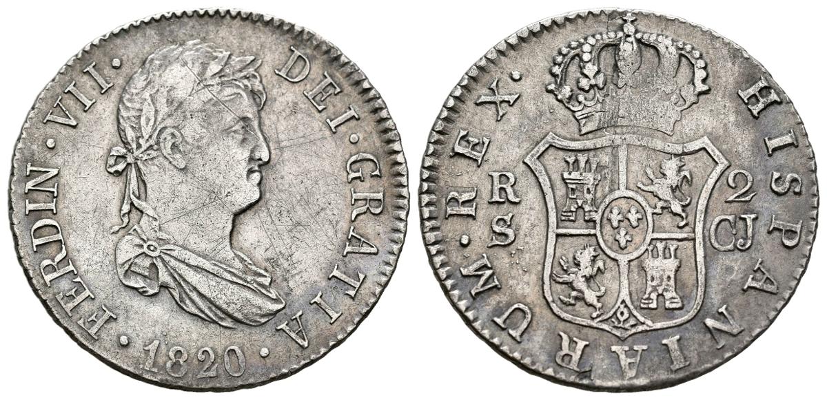 FERNANDO VII (1808-1833). 2 Reales. (Ar. 5,90g/26mm). 1820. Sevilla CJ. (Cal-2019-952). MBC+. Rayas en anverso.