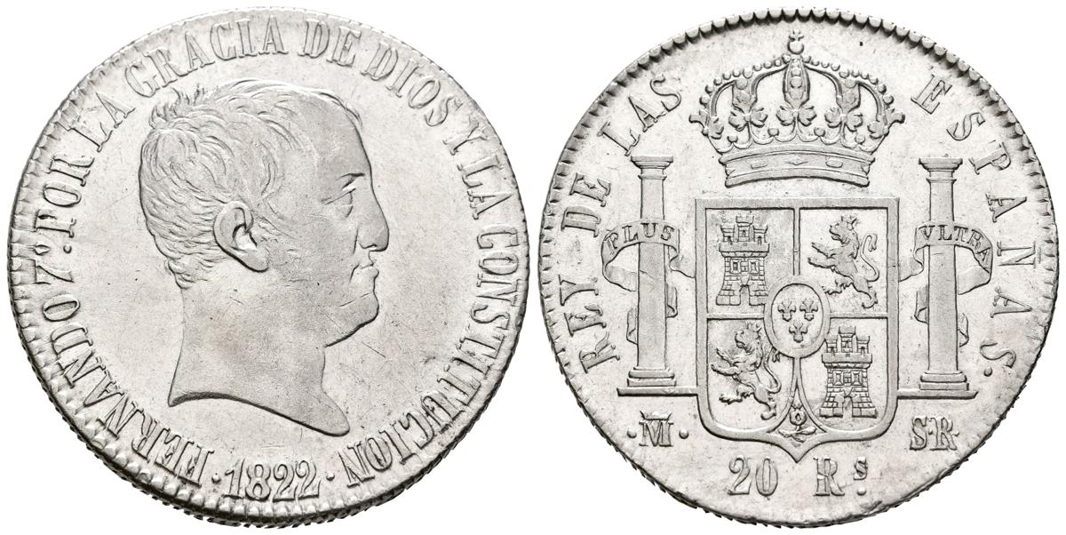 FERNANDO VII (18080-1833). 20 Reales (Ar. 26,95g/38mm). 1822. Madrid SR. (Cal-2019-1282). EBC. Restos de brillo original. Bonito ejemplar, escaso así.