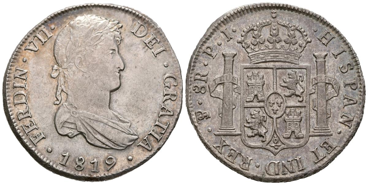 FERNANDO VII (1808-1833). 8 Reales (Ar. 26,87g/38mm). 1819. Potosí PJ. MBC+/EBC-. Preciosa pátina irisada.