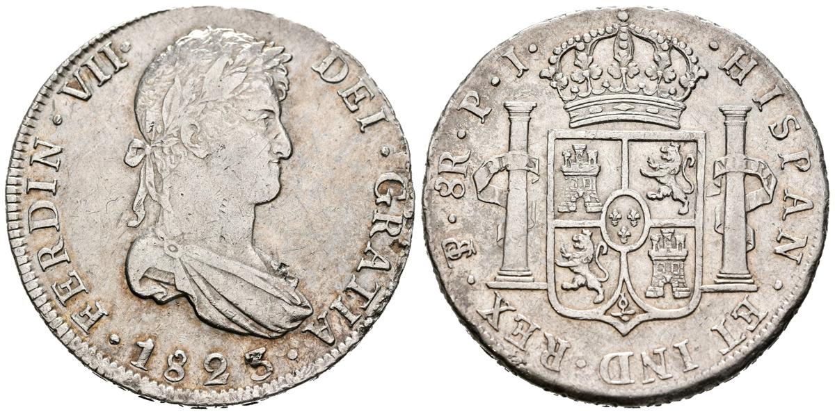 FERNANDO VII (1808-1833). 8 Reales. (Ar. 26,66g/38mm). 1823. Potosí PJ. (Cal-2019-1388). MBC+/EBC-. Restos de brillo original.