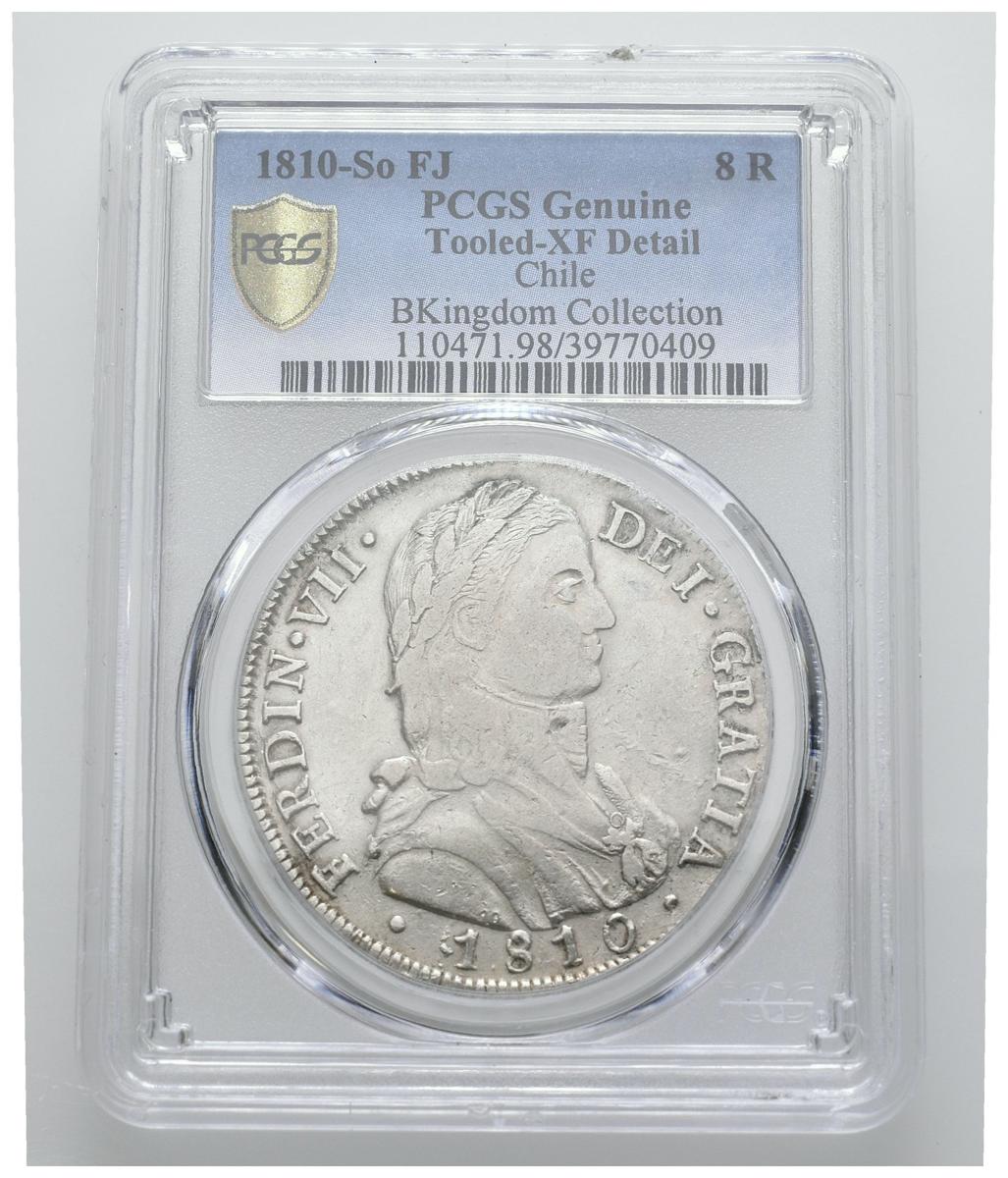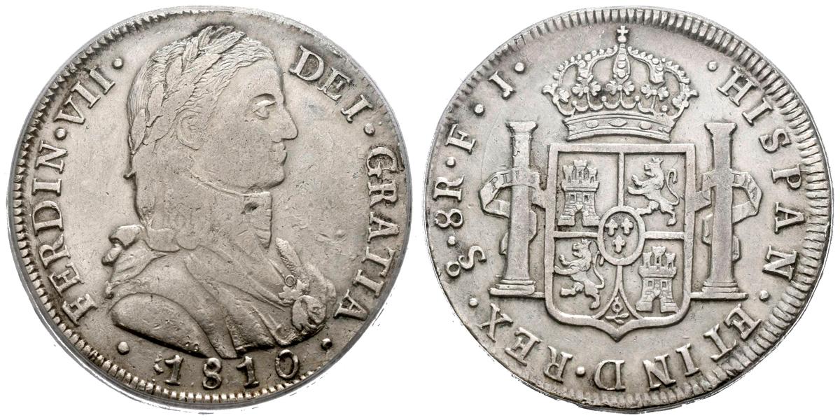 FERNANDO VII (1808-1833). 8 Reales. (Ar. 27,00g/39mm)*. 1810 Santiago FJ. Busto almirante. Casaca sin botones. (Cal-2019-1403). XF Details. Encapsulada por PCGS. *Peso y medidas teóricos.