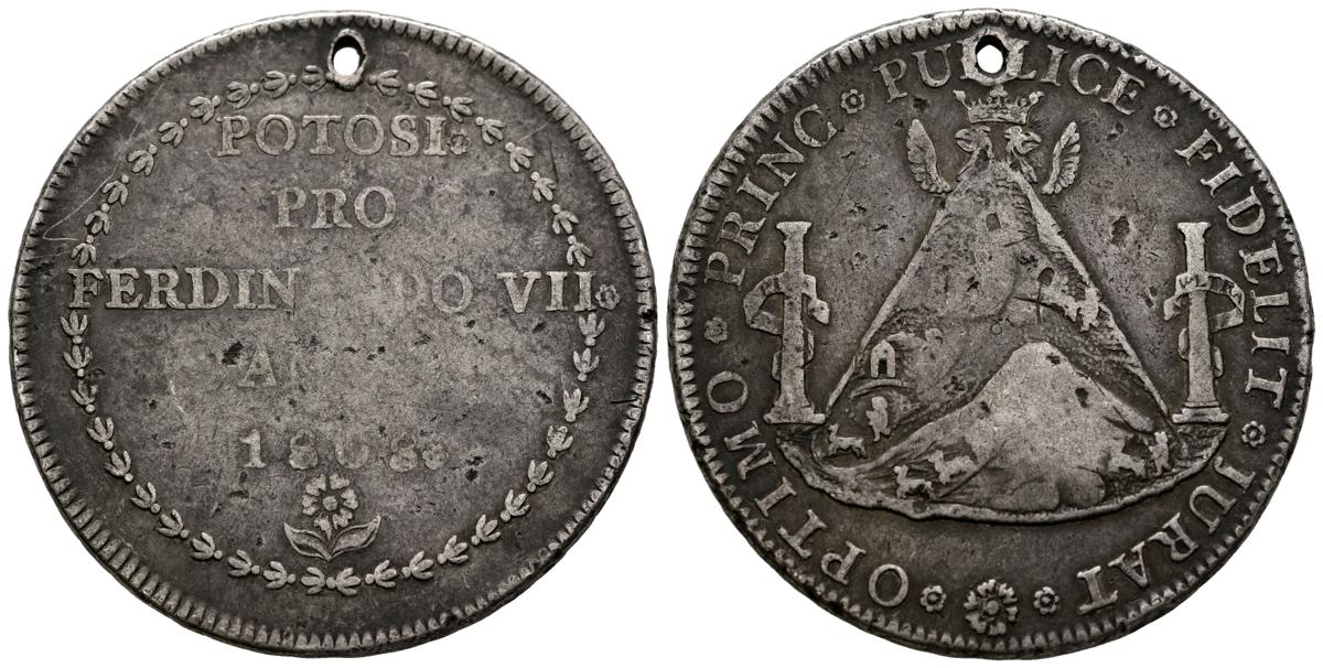 FERNANDO VII (1808-1833). Medalla de proclamación en módulo de 8 Reales. (Ar. 26,52g/39mm). 1808. Potosí. (Ha-50). BC/BC+. Agujero a las 12h.
