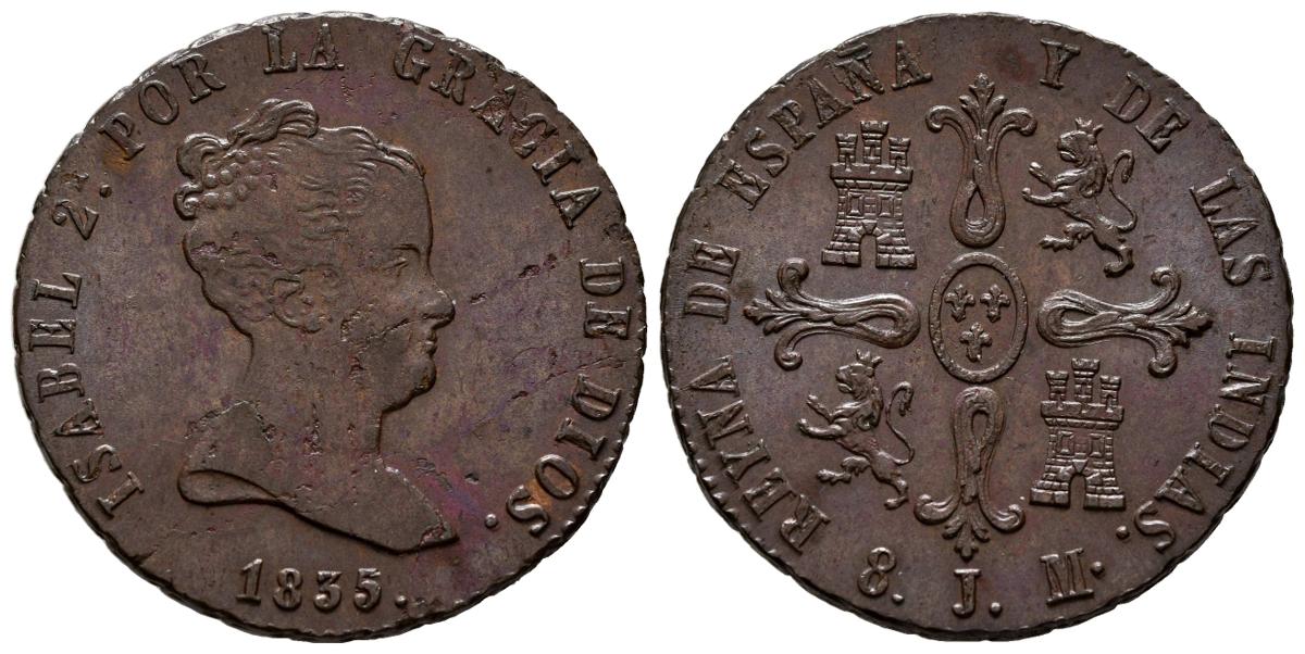 ISABEL II (1833-1868). 8 Maravedís. (Ae. 10,12g/28mm). 1835. Jubia. (Cal-2019-101). Valor y marca de ceca J en el reverso. EBC/EBC+. Defectos en anverso. Rara y más así.
