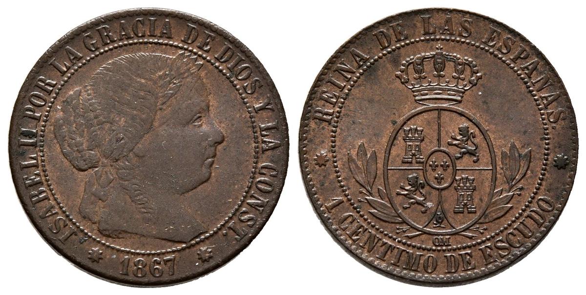 ISABEL II (1833-1868). 1 Céntimo de Escudo. (Ae. 2,56g/18mm). 1867. Barcelona OM. (Cal-2019-2015). EBC-/EBC.