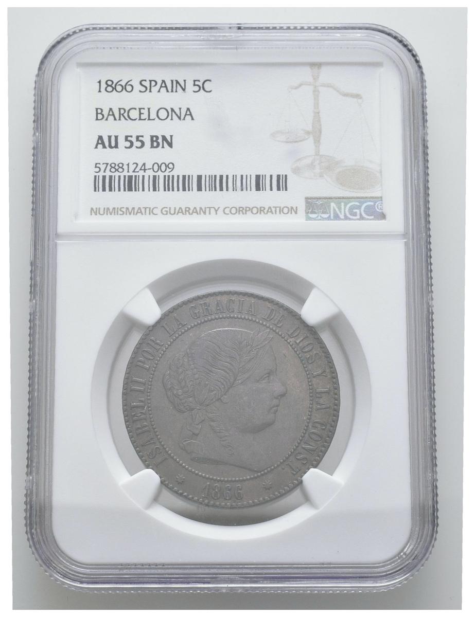 ISABEL II (1833-1868). 5 Céntimos de Escudo. (Ae. 12,00g/32mm)*. 1866. Barcelona. Sin OM. (Cal-2019-244). Encapsulada por NGC AU55 BN. Restos de brillo original. *Peso y medida teóricos.