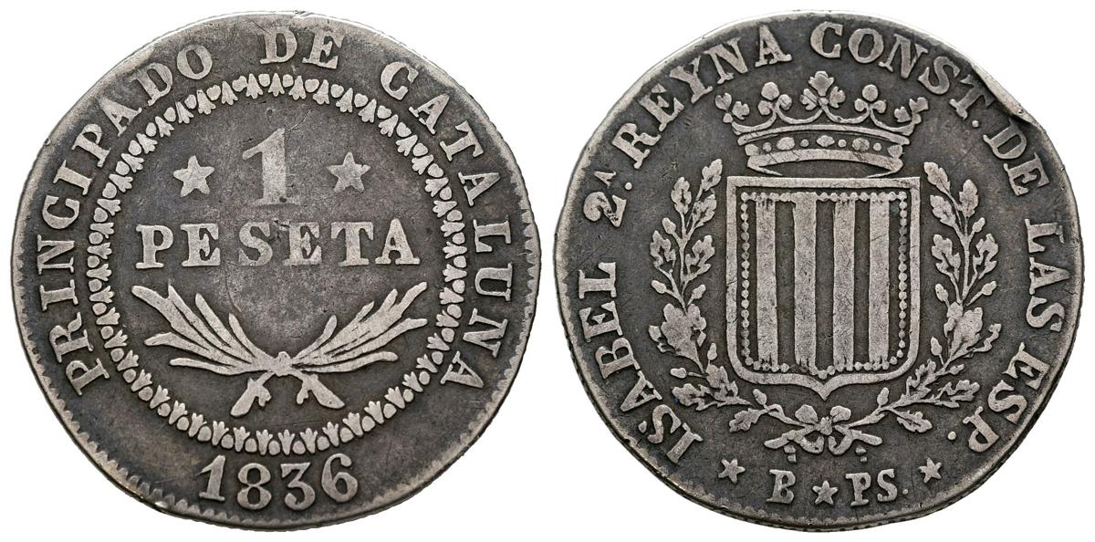 ISABEL II (1833-1868). 1 Peseta (Ar. 5,55g/25mm). 1836. Barcelona PS. (Cal-2019-271). Canto estriado. MBC. Golpe. Bonita pátina negra. Escasa.