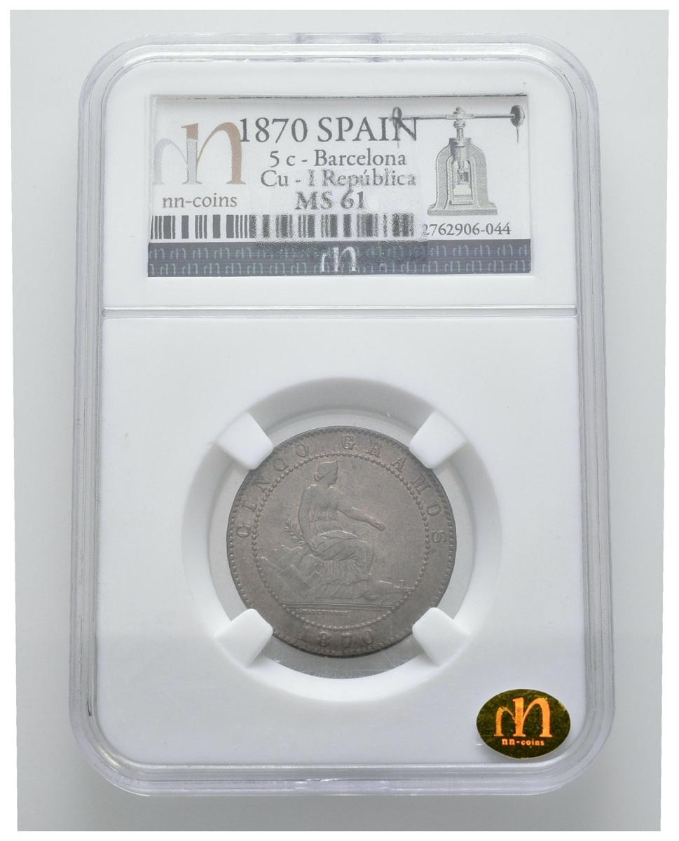 GOBIERNO PROVISIONAL (1868-1871). 5 Céntimos (Ar. 5,00g/25mm)*. 1870. Barcelona OM. (Cal-2019-5). SC-. Excelente ejemplar. *Encapsulada por NN Coins como MS61.