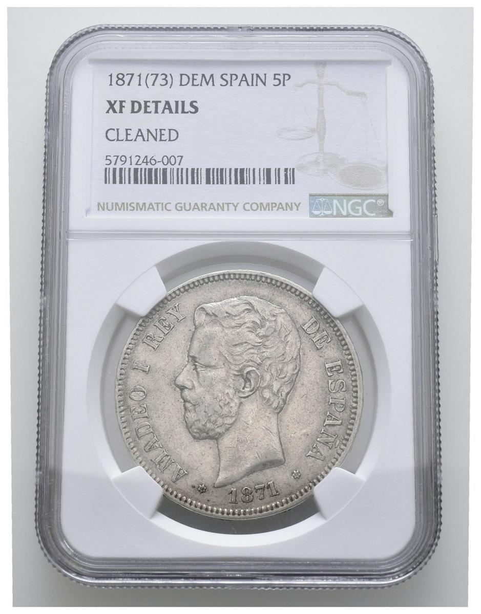AMADEO I (1871-1873). 5 Pesetas. (Ar. 24,68g/37mm)*. 1871 *18-73. Madrid. (Cal-2019-3). Encapsulado por NGC XF Details. Rara. *Peso y medida teórico.
