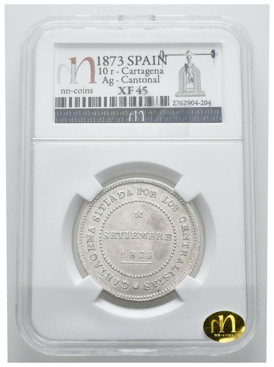 REVOLUCIÓN CANTONAL (1873-1874). 10 Reales (Ar. 13,50g/30mm)*. 1873. Cartagena. (Cal-2019-4). EBC. Precioso y escaso ejemplar. *Encapsulada por NN Coins como XF45.“Sitiada por los centralistas” permaneció el cantón de Cartagena durante la I República. La acuñación de moneda se antojaba como un paso clave e indispensable para su supervivencia. Con plata procedente de las minas de Mazarrón, acuñándose en el Arsenal con maquinaria de estampación para útiles de barco y con mano de obra sacada directamente de la cárcel (se dio amnistía a los falsificadores de moneda) se acuñaron módulos de 10 Reales y 5 Pesetas, de especial rareza los primeros (existe también el módulo de 2 Pesetas pero son consideradas acuñaciones posteriores realizadas por los talleres Mening Freres en Bruselas). Para darle legitimidad a estas acuñaciones, el gobierno cantonés doto a sus piezas de una pureza en el material y un peso superior a la de las monedas que por aquellas fechas se acuñaban en Madrid.