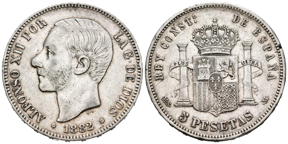 ALFONSO XII (1874-1885). 5 Pesetas. (Ar. 24,78g/37mm). 1882 *18-81. Madrid MSM. (Cal-2019-48). MBC. Escasa.