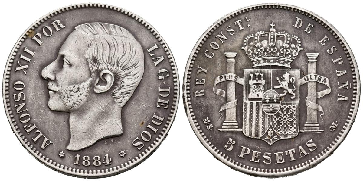 ALFONSO XII (1874-1885). 5 Pesetas. (Ar. 24,86g/37mm). 1884 *18-84. Madrid MSM. (Cal-2019-57). MBC+.