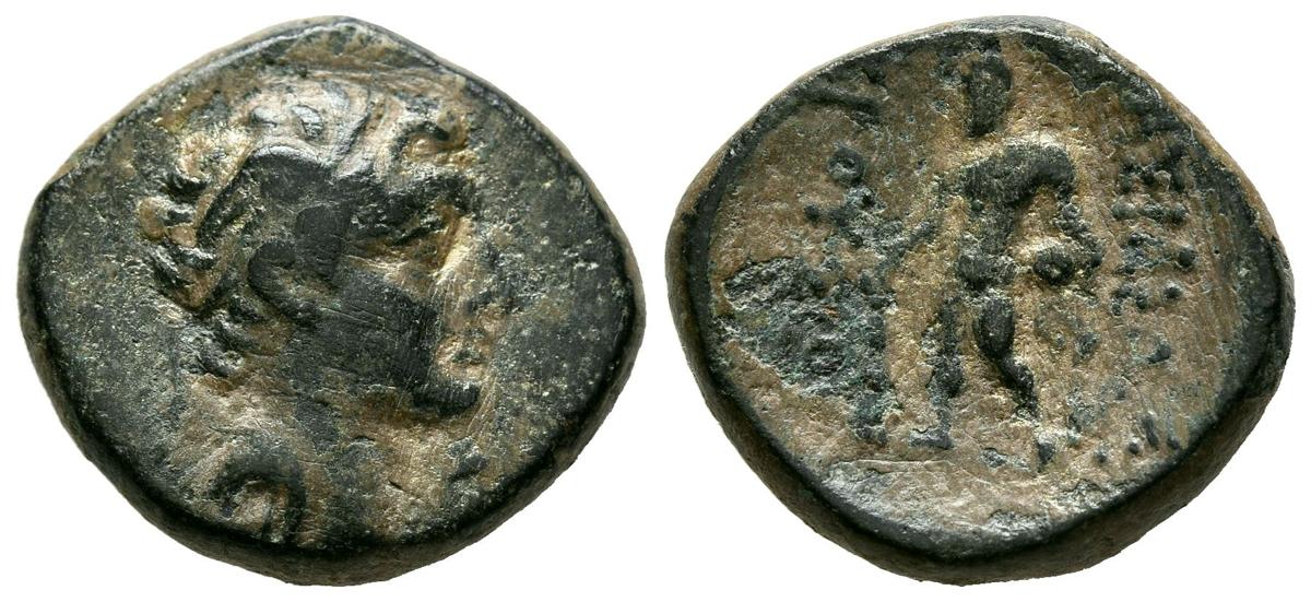 REYES DE BYTHINIA, Prusias II. Ae19. (Ae. 4,88g/19mm). 182-149 a.C. (SNG Copenhagen 631; HGC 7, 634). Anv: Cabeza masculina con corona de laurel alada a derecha. Rev: Heracles estante a izquierda portando maza y globo, alrededor leyenda griega. MBC-.
