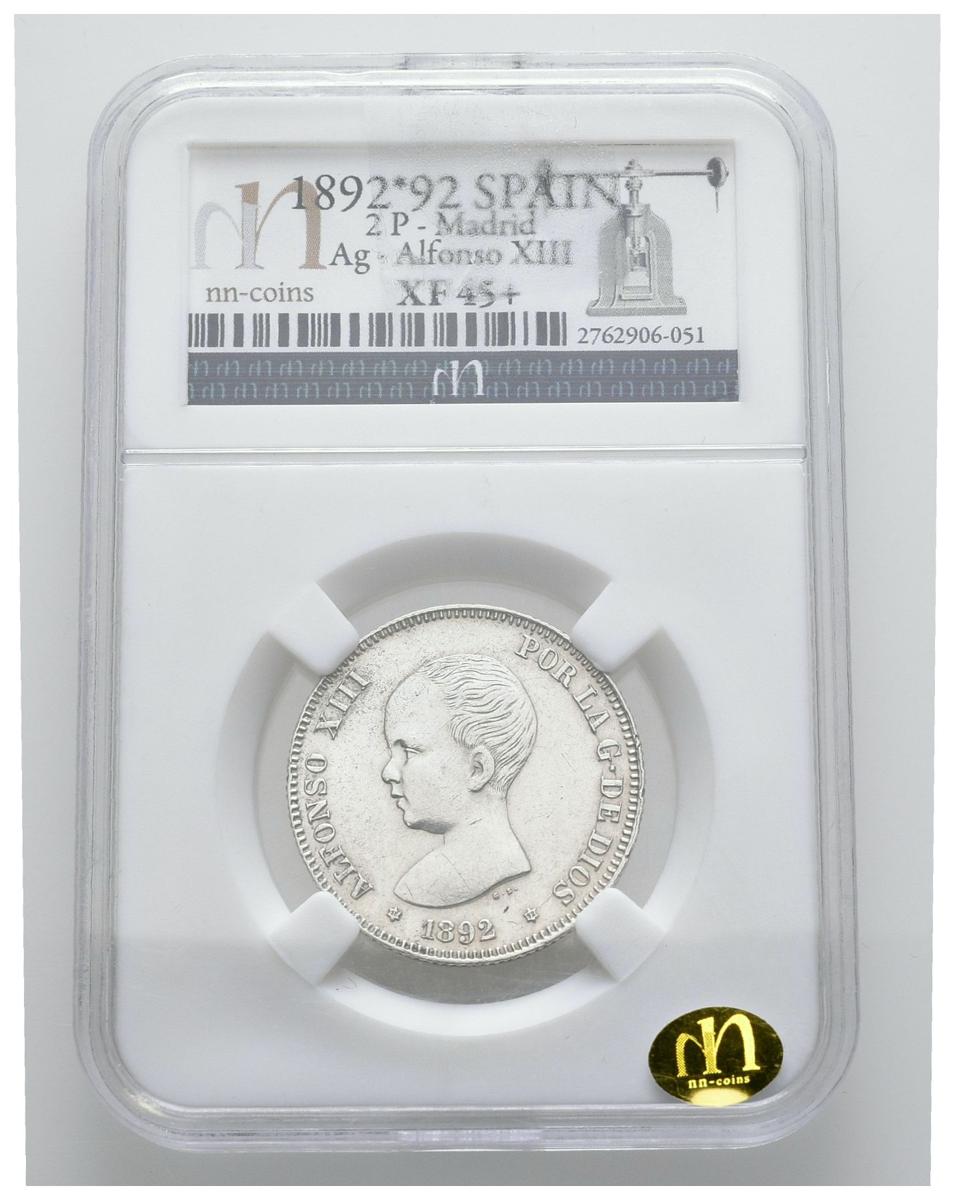 ALFONSO XIII (1885-1931). 2 Pesetas. (Ar. 10,00g/27mm)*. 1892 *18-92. Madrid PGM. (Cal-2019-85). EBC-. Limpiada. *Encapsulada por NN Coins como XF45+.
