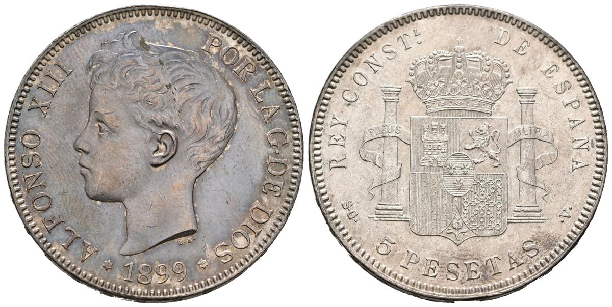ALFONSO XIII (1885-1931). 5 Pesetas. (Ar. 24,80g/37mm). 1899 *18-99. Madrid SGV. (Cal-2019-110). EBC-/MBC+. Bonita pátina en anverso.