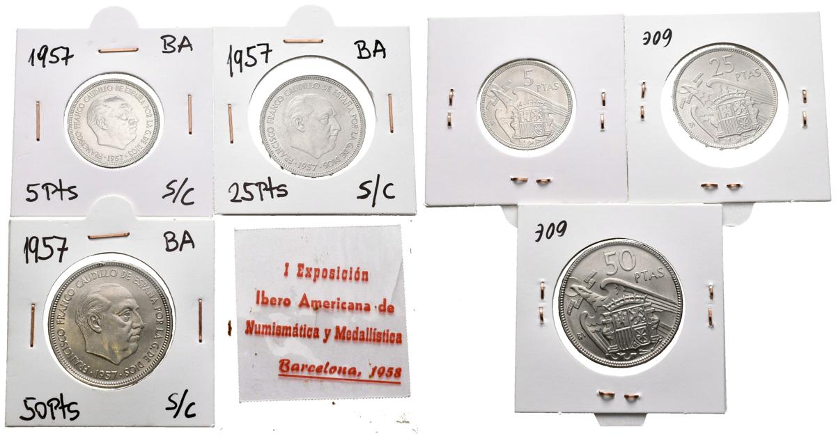ESTADO ESPAÑOL (1936-1975). 5, 25 y 50 Pesetas. 1957 *BA. Barcelona. Serie completa emitida en la I Exposición Iberoamericana de Numismática y Medallística de Barcelona. (Cal-2019-154/155/156). SC-/SC. Incluye pequeño sobre de plástico original de dicha Exposición.