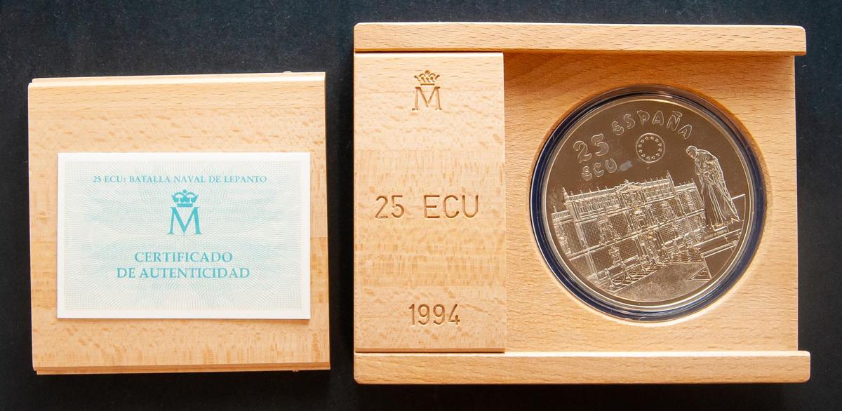 JUAN CARLOS I (1975-2014). 25 Ecu. (Ar. 168,75g/73mm). Cervantes Don Quijote. Batalla de Lepanto. 1994. FNMT. FDC. Presentada en estuche oficial y con certificado de autenticidad. 15.000 unidades acuñadas.