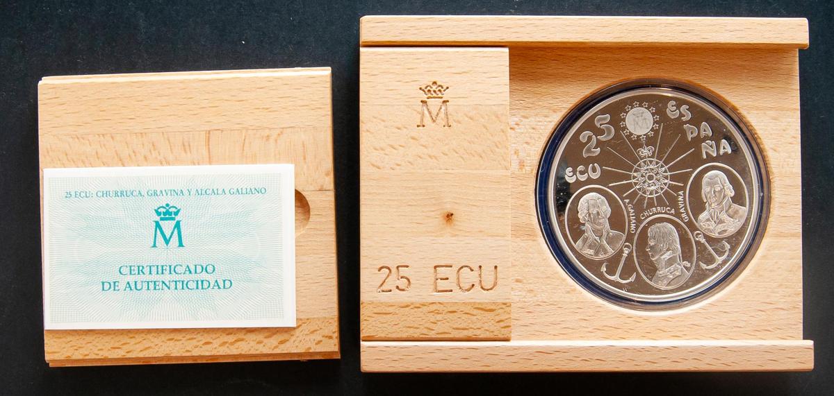 JUAN CARLOS I (1975-2014). 25 Ecu. (Ar. 168,75g/73mm). Serie de la Marina Española. Churruca, Gravina y Alcalá Galiano. 1995. FNMT. FDC. Presentada en estuche oficial y con certificado de autenticidad. 15.000 unidades acuñadas.