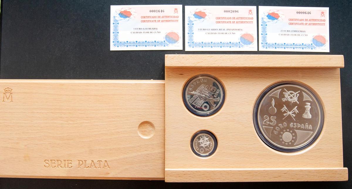 JUAN CARLOS I (1975-2014). Serie completa del Homenaje al Ejercito de Tierra: 1, 5 y 25 Euros en plata. 1998. FNMT. PROOF. Presentada en estuche oficial, con cápsulas y certificado de autenticidad.