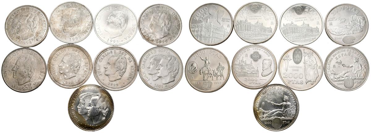 JUAN CARLOS I (1975-2014). Conjunto de 9 monedas de 2000 Pesetas en plata acuñadas entre 1994 y 2001. Diferentes estados de conservación. A EXAMINAR.