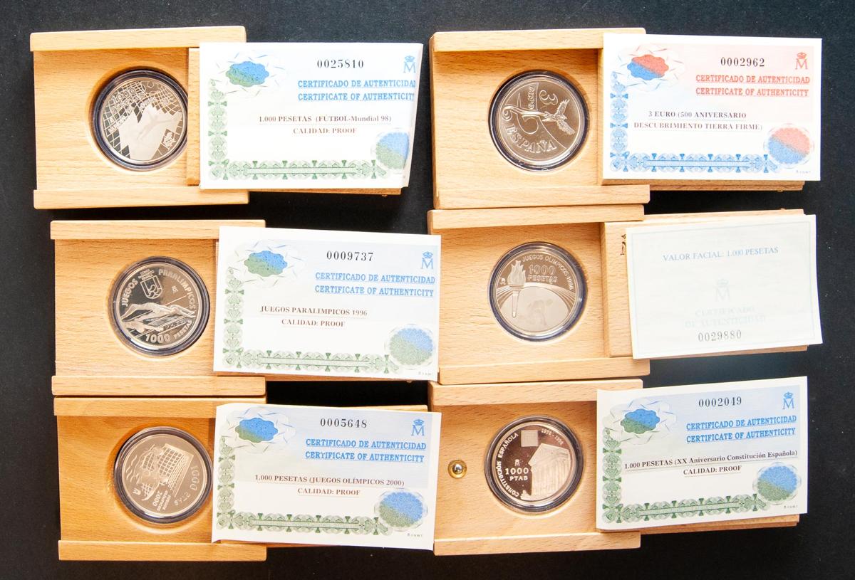 JUAN CARLOS I (1975-2014). Conjunto de 7 monedas de plata (6 de ellas con estuches oficiales y certificados de autenticidad) con valores de 1000 Pesetas (6) y 3 Euros (1). PROOF. A EXAMINAR.