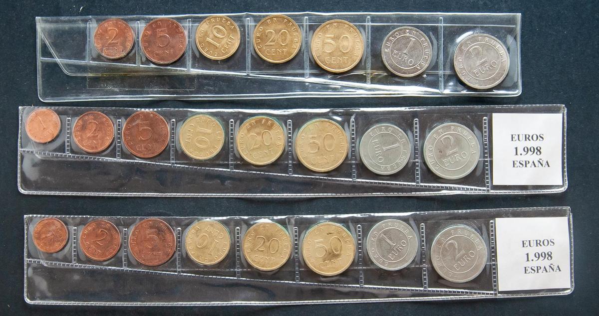 JUAN CARLOS I (1975-2014). Conjunto de 7 tiras completas de los Euros en Prueba de Churriana (Málaga) con valores comprendidos entre 1 Céntimo y 2 Euros. 1998. SC.