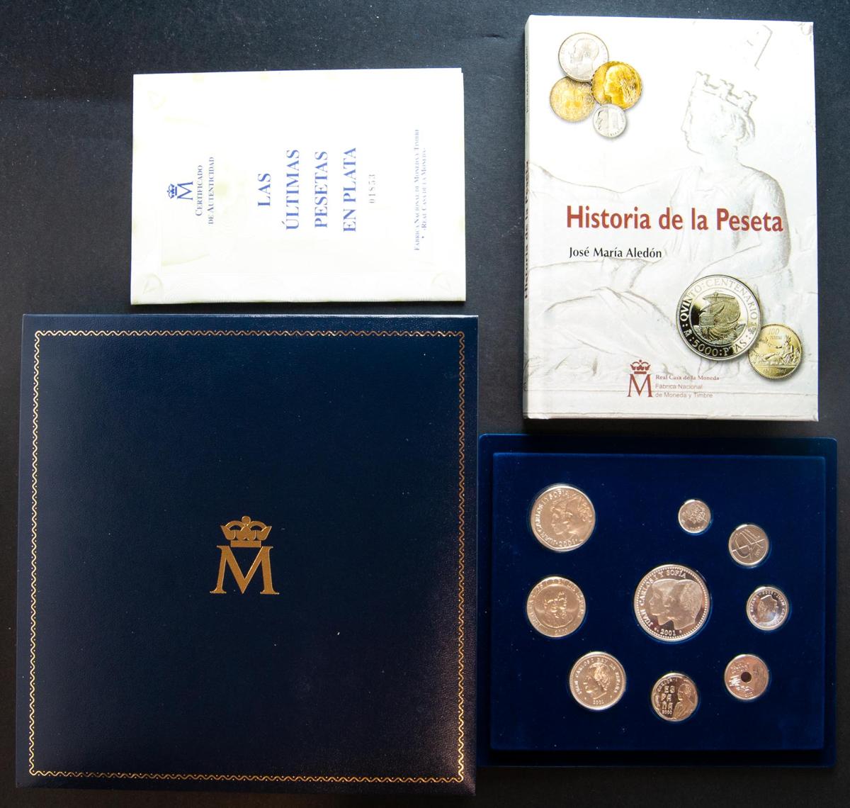 JUAN CARLOS I (1975-2014). Las Últimas Pesetas en Plata. Serie completa conmemorativa con los valores: 1, 5, 10, 25, 50, 100, 200, 500 y 2000 Pesetas. 2000-2001. FNMT. PROOF. Presentadas en estuche oficial, incluyendo certificado de autenticidad y libro de Jose María Aledón: "Historia de la Peseta".