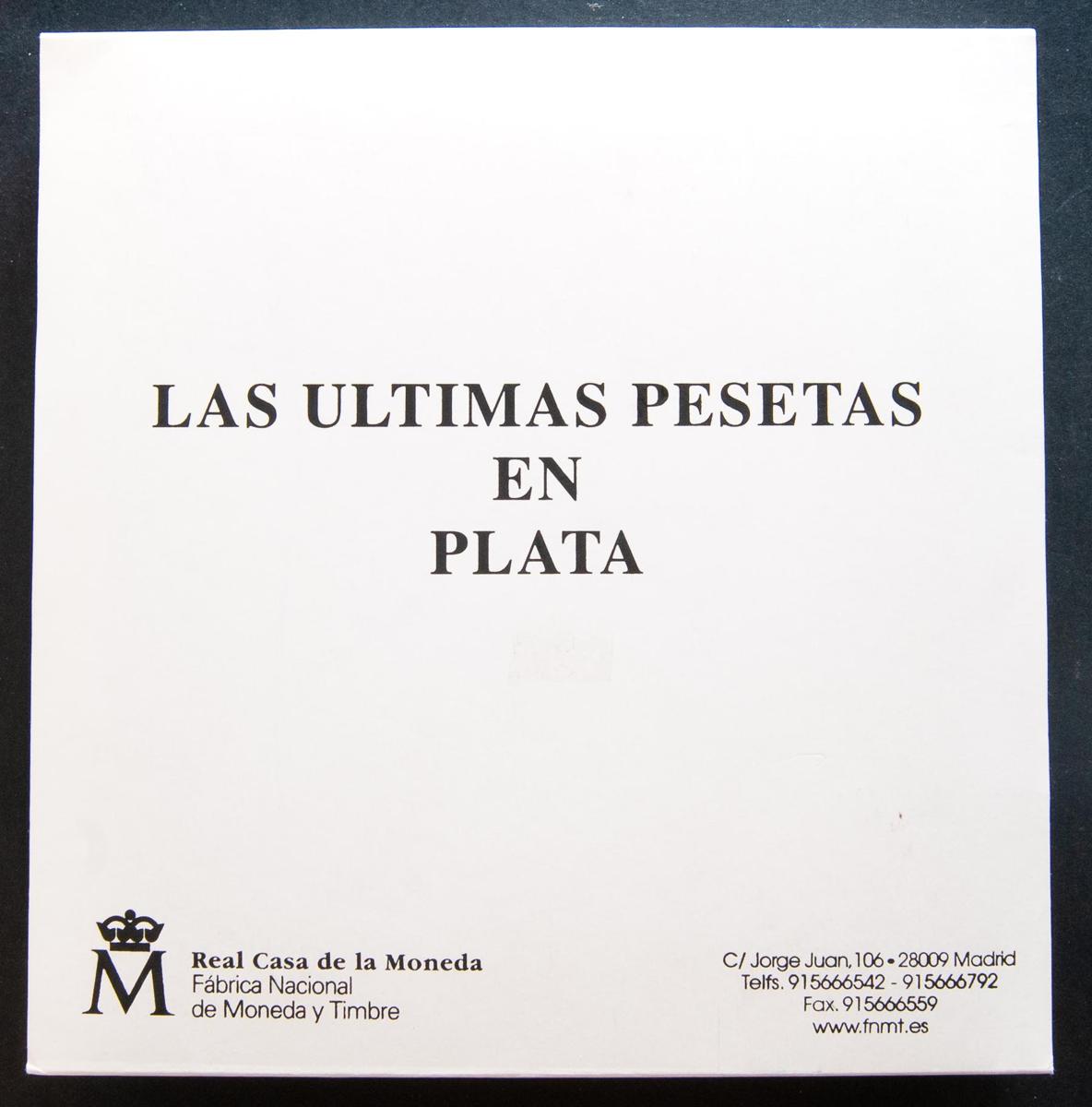 JUAN CARLOS I (1975-2014). Las Últimas Pesetas en Plata. Serie completa conmemorativa con los valores: 1, 5, 10, 25, 50, 100, 200, 500 y 2000 Pesetas. 2000-2001. FNMT. PROOF. Presentadas en estuche oficial, incluyendo certificado de autenticidad y libro de Jose María Aledón: "Historia de la Peseta".