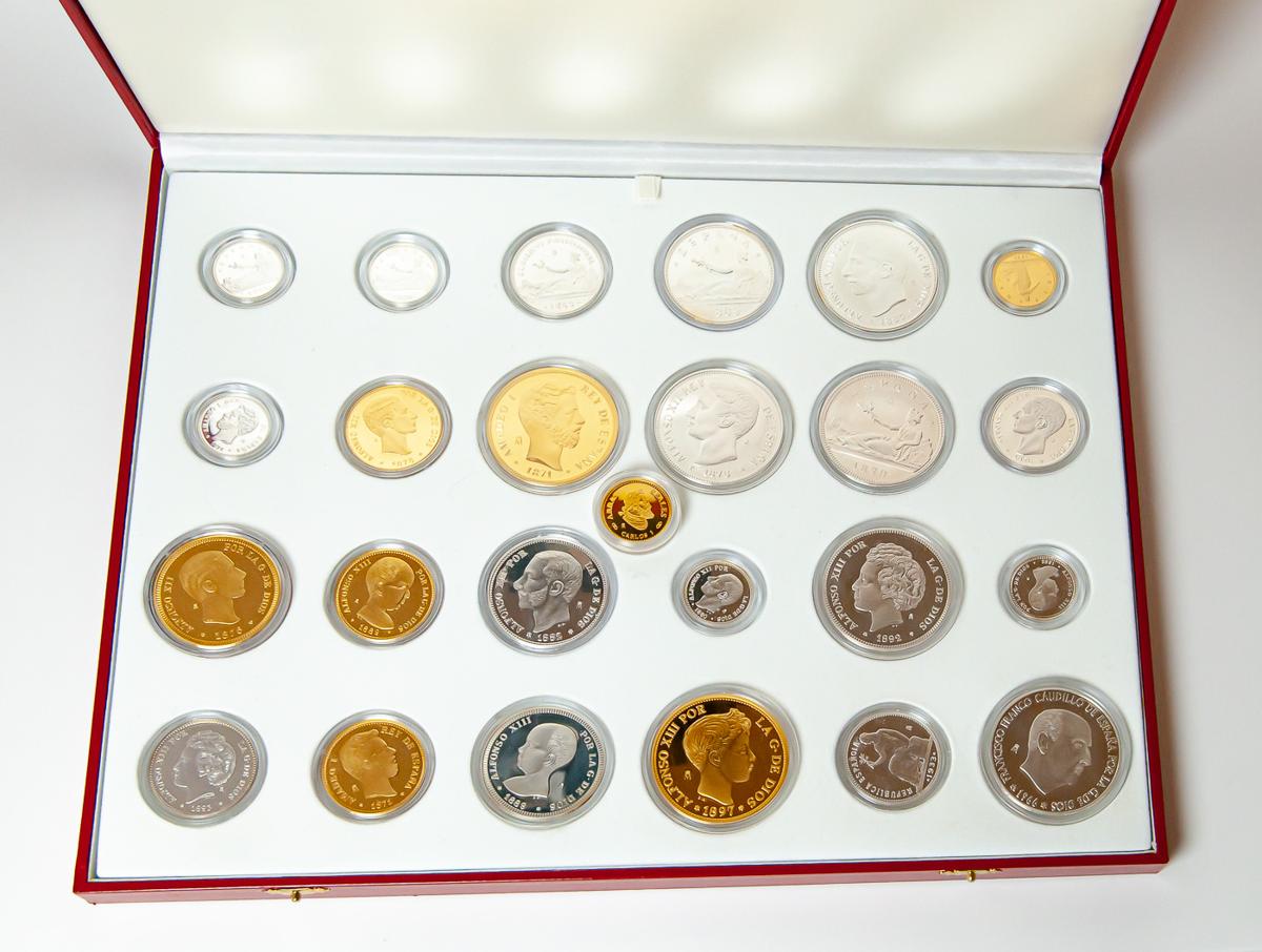 JUAN CARLOS I (1975-2014). Emisión conmemorativa especial de 24 réplicas de la Historia de la Peseta. FNMT. Todas las piezas en plata y plata sobredorada de 0,925 milésimas. Incluye estuche original. Además se acompaña de una Arra Real (también en plata sobredorada y de la FNMT) de Carlos I. Peso total del conjunto en plata aproximado: 554g. FDC. A EXAMINAR.