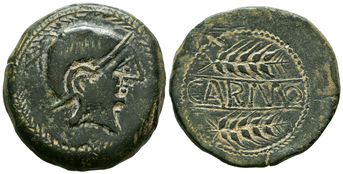 CARMO (Carmona, Sevilla). As. (Ae. 21,09g/33mm). 80 a.C. (FAB-454). Anv: Cabeza masculina con casco a derecha, dentro de corona de laurel. Rev: Dos espigas a derecha, entre ellas leyenda: CARMO. MBC+.