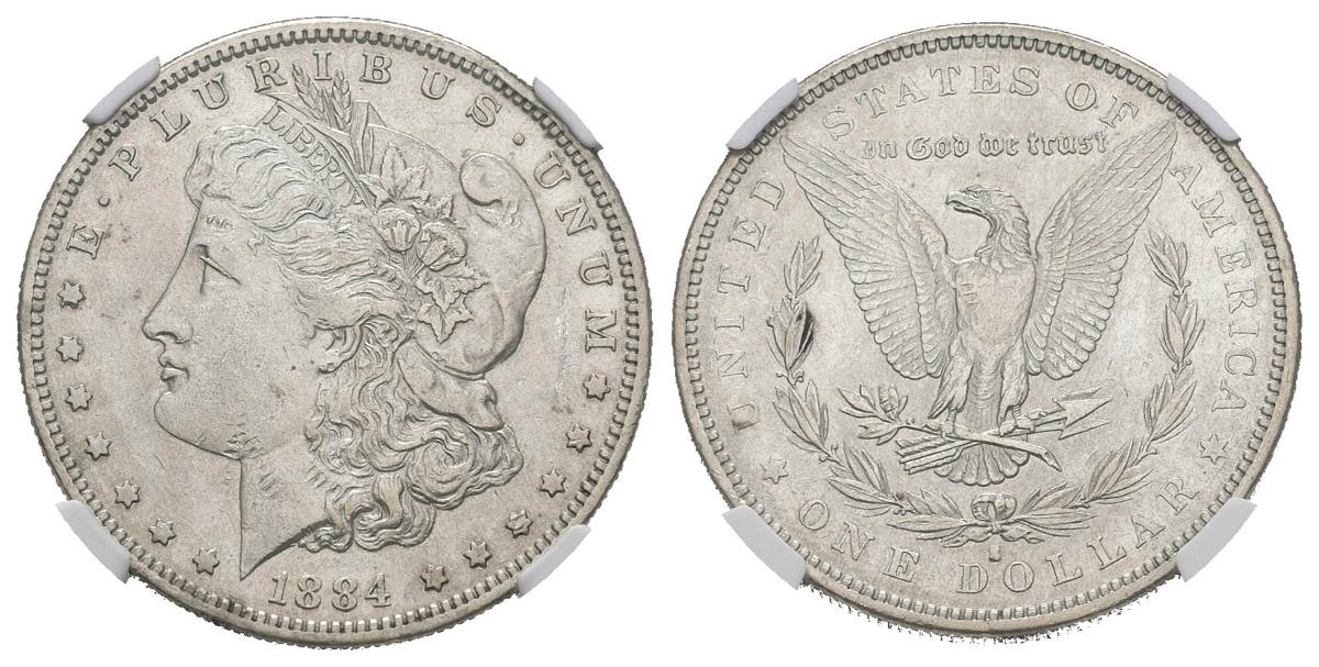 ESTADOS UNIDOS. 1 Dollar (Ar. 26,73g/38mm)*. 1884. San Francisco S. (Km#110). AU Details. Marcas en anverso. Encapsulado por NGC. *Peso y medida teórico.