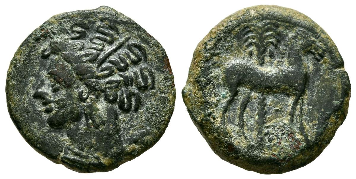 CARTAGONOVA (Cartagena, Murcia). 1/2 Calco. (Ae. 3,08g/17mm). 220-215 a.C. (FAB-507). Anv: Cabeza de Tanit a izquierda. Rev: Caballo parado a derecha, detrás palmera. MBC+.