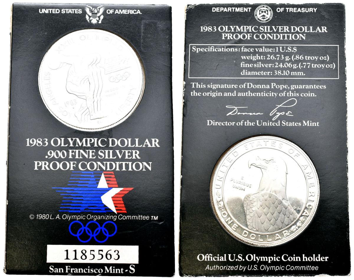 ESTADOS UNIDOS. 1 Dollar. (Ar. 26,73g/38mm). 1983. San Francisco. Olimpiada de Los Ángeles 1984. Lanzamiento de Disco. (Km#209). PROOF. En blister original.