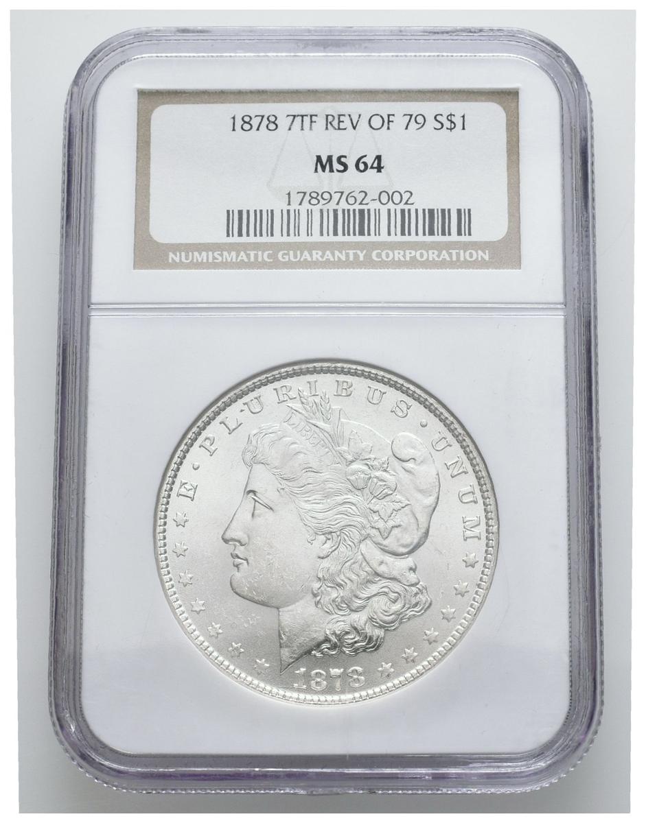 ESTADOS UNIDOS. 1 Dollar (Ar. 26,73g/38mm)*. 1878. Philadelphia. (Km#110). Encapsulado por NGC MS64. 7TF. Rev of 79. *Peso y medida teórico.