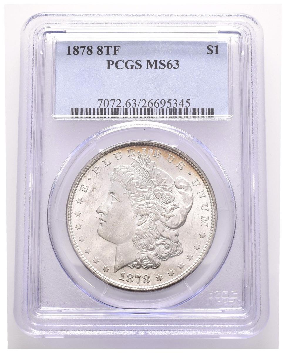 ESTADOS UNIDOS. 1 Dollar (Ar. 26,73g/38mm)*. 1878. Philadelphia. 8TF. (Km#110). Encapsulado por PCGS MS63. *Peso y medida teórico.