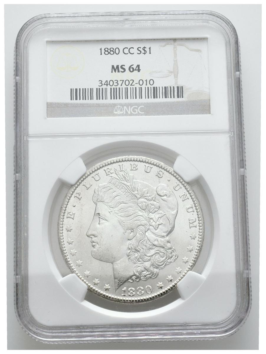 ESTADOS UNIDOS. 1 Dollar (Ar. 26,73g/38mm)*. 1880. Carson City CC. (Km#110). Encapsulado por NGC MS64. *Peso y medida teórico.