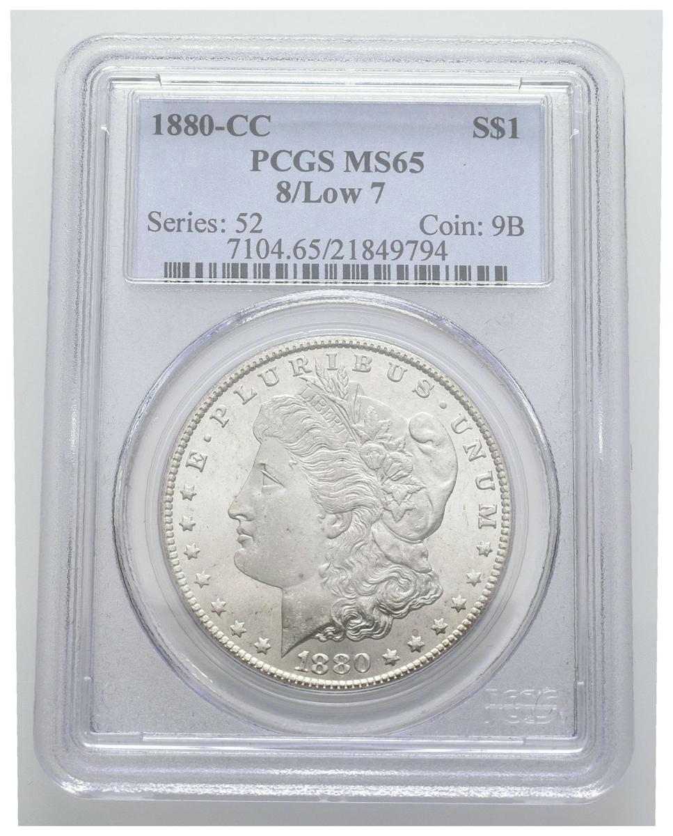 ESTADOS UNIDOS. 1 Dollar (Ar. 26,73g/38mm)*. 1880. Carson City CC. 8/Low 7. (Km#110). Encapsulado por PCGS MS65. *Peso y medida teórico.