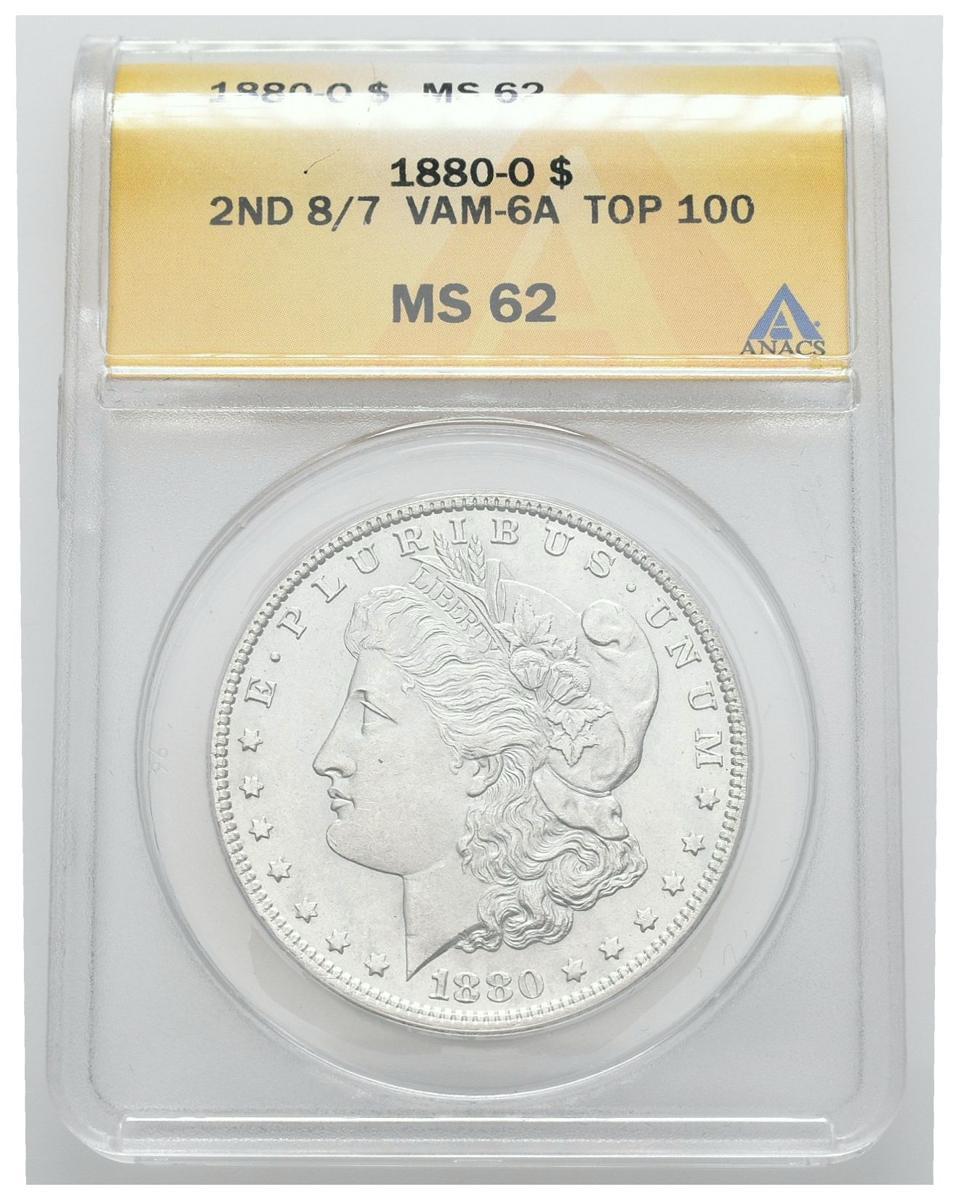 ESTADOS UNIDOS. 1 Dollar (Ar. 26,73g/38mm)*. 1880/0 2nd 8/7. Nueva Orleans O. VAM-6A. TOP 100. (Km#110). Encapsulado por ANACS MS62. *Peso y medida teórico.