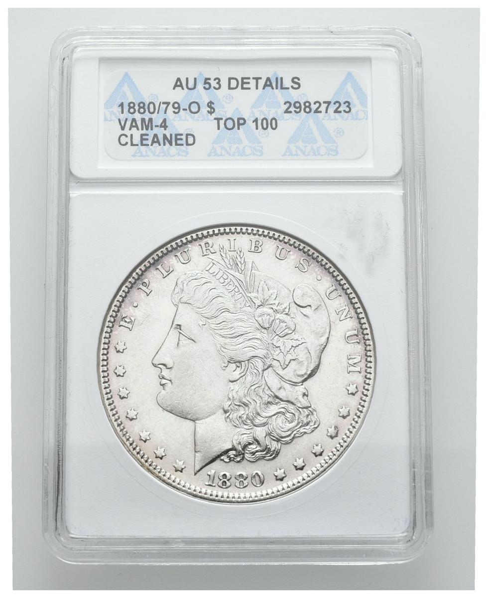 ESTADOS UNIDOS. 1 Dollar (Ar. 26,73g/38mm)*. 1880/79. Nueva Orleans O. VAM-4. TOP 100. (Km#110). Limpiada. Encapsulado por ANACS AU53. *Peso y medida teórico.