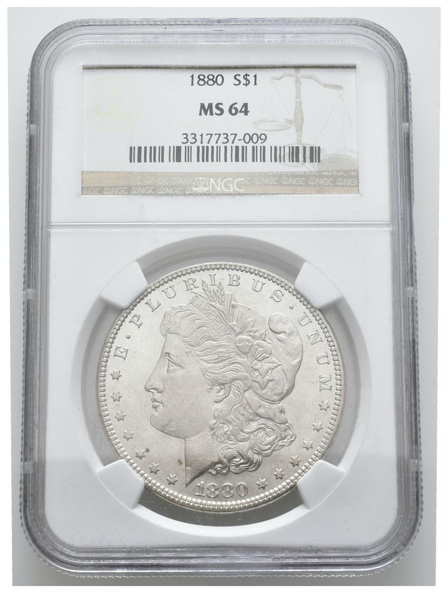 ESTADOS UNIDOS. 1 Dollar (Ar. 26,73g/38mm)*. 1880. Philadelphia. (Km#110). Encapsulado por NGC MS64. *Peso y medida teórico.