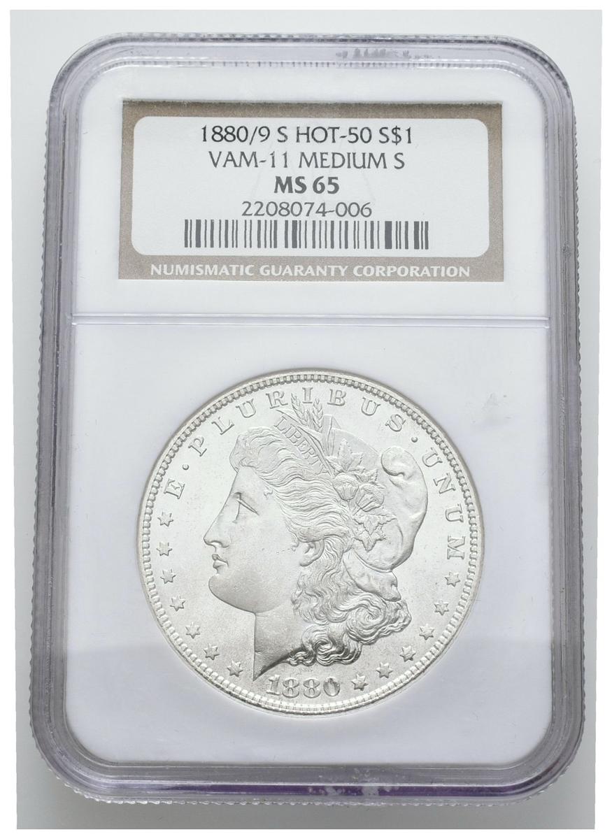 ESTADOS UNIDOS. 1 Dollar (Ar. 26,73g/38mm)*. 1880/9. San Francisco S. Hot -50. VAM-11. Medium S.(Km#110). Encapsulado por NGC MS65. *Peso y medida teórico.