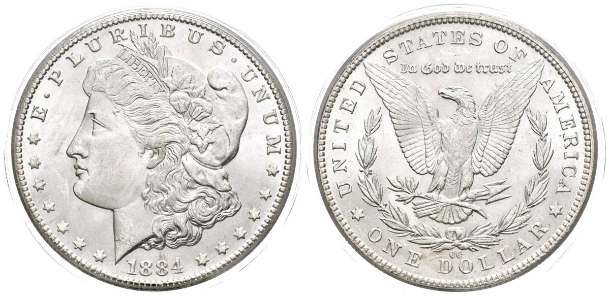 ESTADOS UNIDOS. 1 Dollar (Ar. 26,73g/38mm)*. 1884. Carson City CC. (Km#110). Encapsulado por PCGS MS64. *Peso y medida teórico.