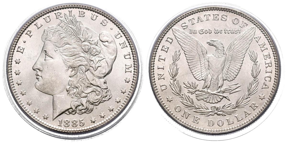 ESTADOS UNIDOS. 1 Dollar (Ar. 26,73g/38mm)*. 1885. Philadelphia. (Km#110). Encapsulado por PCGS MS64+. *Peso y medida teórico.